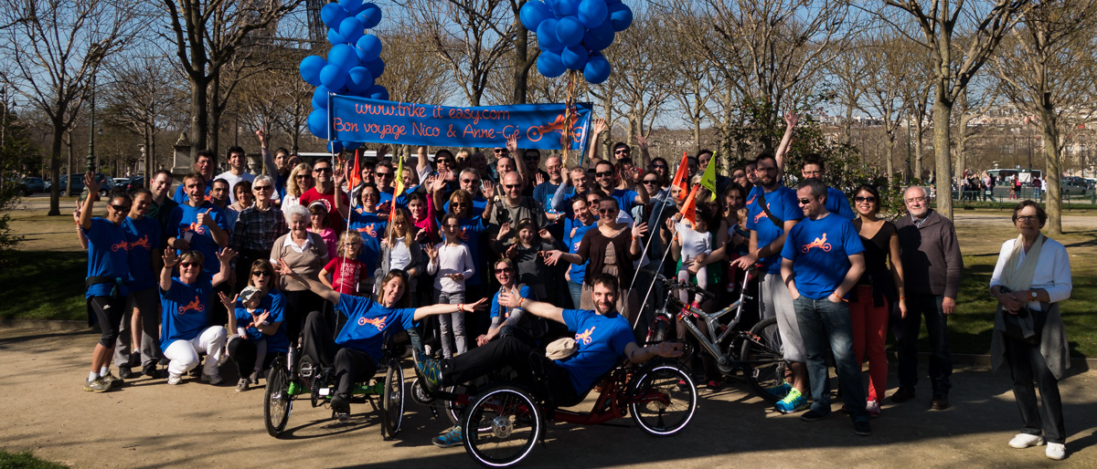 Famille et amis, petits et grands, certains venus de loin. Tous, de bleus vêtus, s’étaient réunis dimanche au pied de la Tour Eiffel pour nous souhaiter un bon voyage. Un très bon moment riche en surprises mais trop court à notre goût. Nous aimerions profiter plus longuement de tout le monde mais l’aventure n’attend pas (c’est rien de le dire – à découvrir dans la suite de l’article) et nous avons déjà du retard sur notre planning.