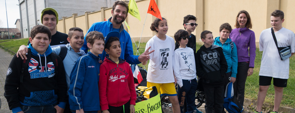 Au fur et à mesure que nous nous éloignons des montagnes, la route perd de son charme mais nous réserve de belles rencontres. La 1ère avec Maddalena qui nous arrête sur le bord de la route. Elle parle anglais, nous demande en quoi consiste notre projet et nous propose tout de suite de nous inviter dans l’hôtel pour lequel elle travaille. Nous n’osons pas croire à une telle proposition mais la suivons jusqu’à l’école où elle doit récupérer son fils. Les trikes font sensation auprès des enfants. Une partie d’entre eux nous escortent même jusqu’à l’hôtel ! La Locanda dell’arte est situé sur les hauteurs du village de Solonghello. La dernière montée est raide mais comme dit Maddalena « It worths it ! » Et ça c’est le moins qu’on puisse dire. Maddalena nous fait visiter l’hôtel : chambre grand confort, piscine, salon et terrasse panoramiques… Nous n’arrivons pas à croire que nous allons passer la nuit ici. ça nous change de notre nuit précédente en camping sauvage ! Pour le dîner, le chef nous prépare des agnolloti, pâtes fourrées typiques du Piémont, un délice ! Nous avons même droit à la visite du maire ! Nous ne pensions pas vivre ce genre de choses au cours de notre voyage. Un grand merci à Maddalena et Maria pour leur accueil chaleureux et pour nous avoir offert cette escale de rêve.