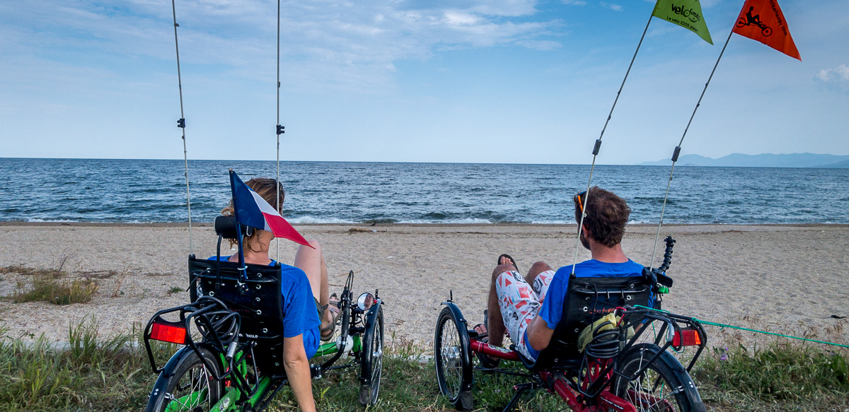 Allongés sous la tente, vélos couchés, transat (espèce de vélo sans roue), les photos nous montrent que vous quittez le monde vertical pour l’horizontalité!