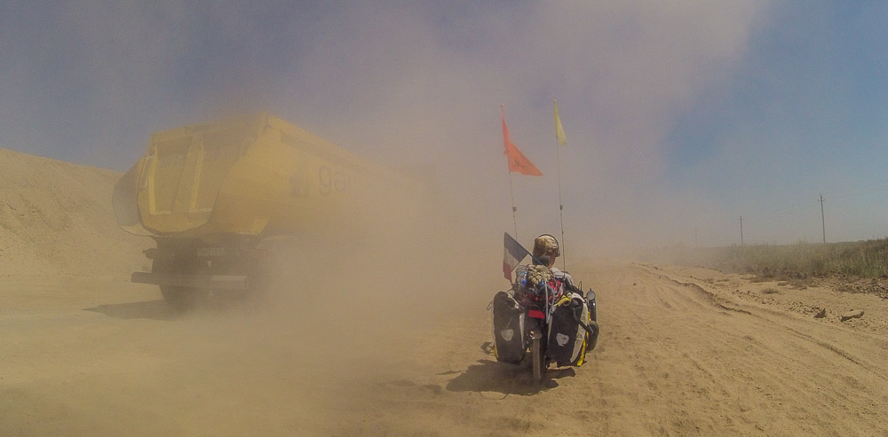 Dés le départ, le Turkménistan, ça nous a pas fait rêver : un grand désert de 500 km, un visa de transit de seulement 5 jours pour le traverser avec, a priori, un vent de face… Bref, on savait que ça n’allait pas être une partie de plaisir ! Ça s’est finalement avéré encore pire que ce que l’on pensait…