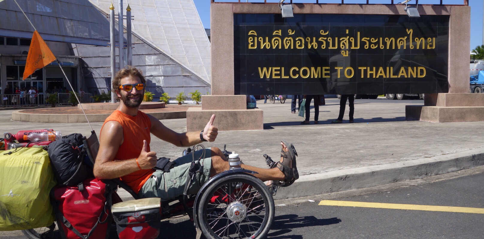 Jeudi 11 décembre – 7h30, on est sur les trikes. C’est parti pour 140 km, notre plus grosse journée depuis le début du voyage. Le vent est avec nous aujourd’hui, on avance bien. On a aussi quitté les gros axes pour pédaler sur des routes secondaires au milieu de la campagne thaïlandaise, c’est plus agréable. On arrive à la dernière ville avant la frontière sans avoir le sentiment d’avoir fait autant de km. Comme dirait Nico, on commence à devenir bons ! Au premier hôtel où on s’arrête, la réceptionniste me dit « friends, friends » en me montrant le garage. Je ne comprends pas trop jusqu’au moment où je découvre 2 trikes, les mêmes que les nôtres. Incroyable ! Les premiers qu’on croise depuis notre départ. On rencontre leurs propriétaires, un couple de Lyonnais en voyage d’un an autour du monde. Ils prennent d’ailleurs l’avion dès le lendemain pour l’Australie. On est super contents de pouvoir échanger avec eux. Comme prévu, on retrouve aussi Pascale et Marc qu’on avait quitté au Laos et qui avaient pris un peu d’avance sur nous.