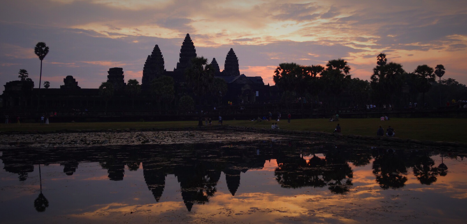 6h : l’aube fait sa grande apparition et la silhouette d’Angkor Wat se dessine devant nous, majestueuse. Angkor Wat est le plus grand des temples et le mieux préservé du site. Construit au début du XIIe siècles, il a été conçu pour représenter le mont Meru, la maison des dieux dans la mythologie indienne. Ce n’est qu’au XVe siècles que le temple fut adapté au culte bouddhiste après remaniement du sanctuaire central. Nous continuons la visite avec le Bayon, le temple central de l’ancienne ville d’Angkor Thom, capitale des souverains Khmers au XIIIe siècles. Ils se distinguent par ses tours à 4 visages représentant les différents rois. Nous finissons avec Ta Dom, plus modeste mais surprenant avec ces arbres qui ont enlacé les murs de leurs racines. Le site est célèbre car il a servi de décor à l’une des scènes du film Tomb Raider. A 13h30, on a eu notre dose de vieilles pierres, on reviendra demain pour la suite de la visite.